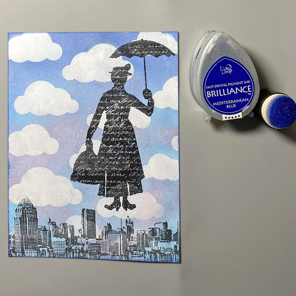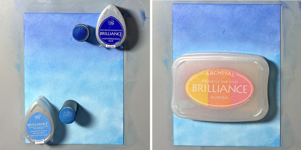 Use a Sponge Dauber to apply Mediterranean Blue Brilliance ink horizontally across the top of a 4” x 5.25” panel of white cardstock. Use a Sponge Dauber to apply Pearlescent Sky Blue Brilliance ink below the darker blue. Use both daubers to create a blended shimmery sky.