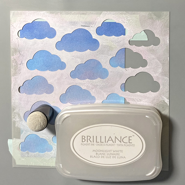 Using a Sponge Dauber, apply Moonlight White Brilliance ink over the stencil onto the image panel.