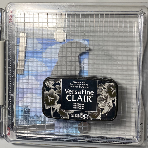 Position the Silhouette Lady with Umbrella Stamp facedown along the right edge above the cityscape.