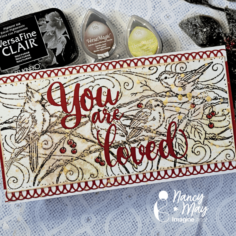Pyrography is the art of wood burning and it has a very distinctive look. This stamping technique has a very similar look. Be sure to use watercolor card or this technique will likely not work. You will also need a stamping platform, water mister and a water reactive dye ink like VersaMagic, and a non-water reactive pigment ink, like VersaFine Clair. Let’s get into it.