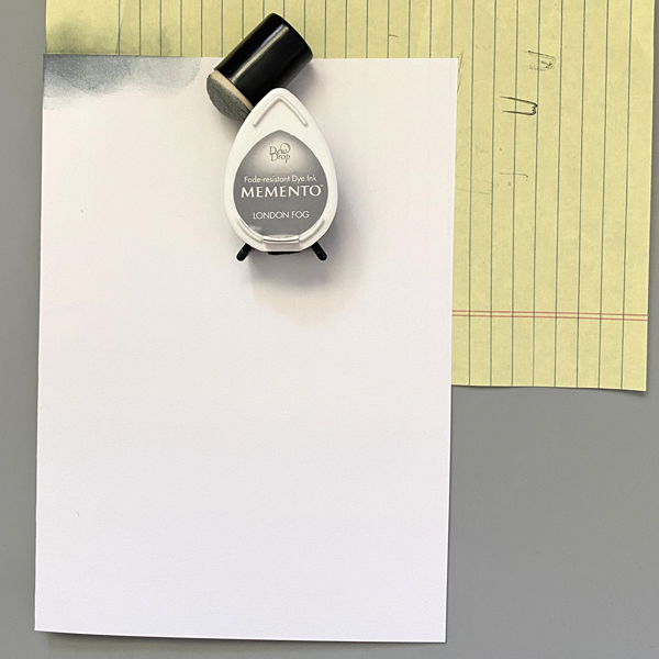 Create a 7” x 5” card from white cardstock. Apply London Fog Memento Ink around the edges of the white cardstock.
