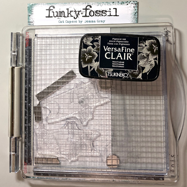 Use a stamping platform and Nocturne VersaFine Clair Ink to stamp two cats from the Cat Capers Clear Stamp Set onto a panel of Bristol Paper. Heat set.