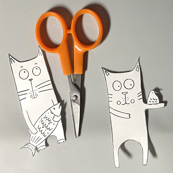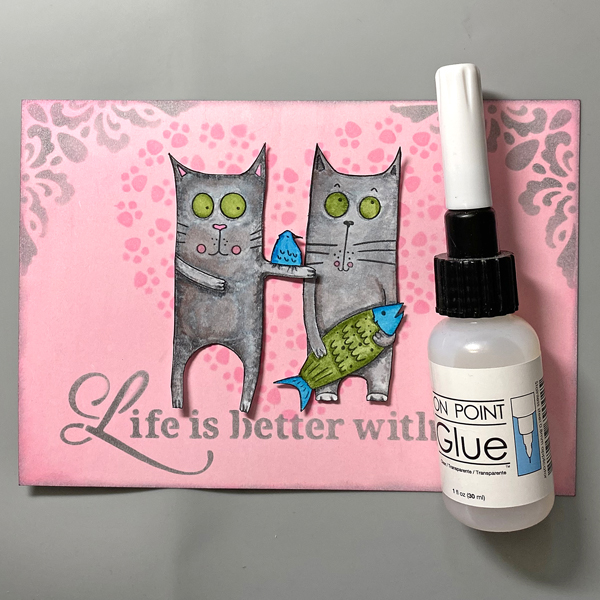 Smoosh London Fog Memento Ink onto a craft mat. Mist with water. Use a fine paintbrush to color the cats’ fur. Clean the ink off of the craft mat and the paint brush.