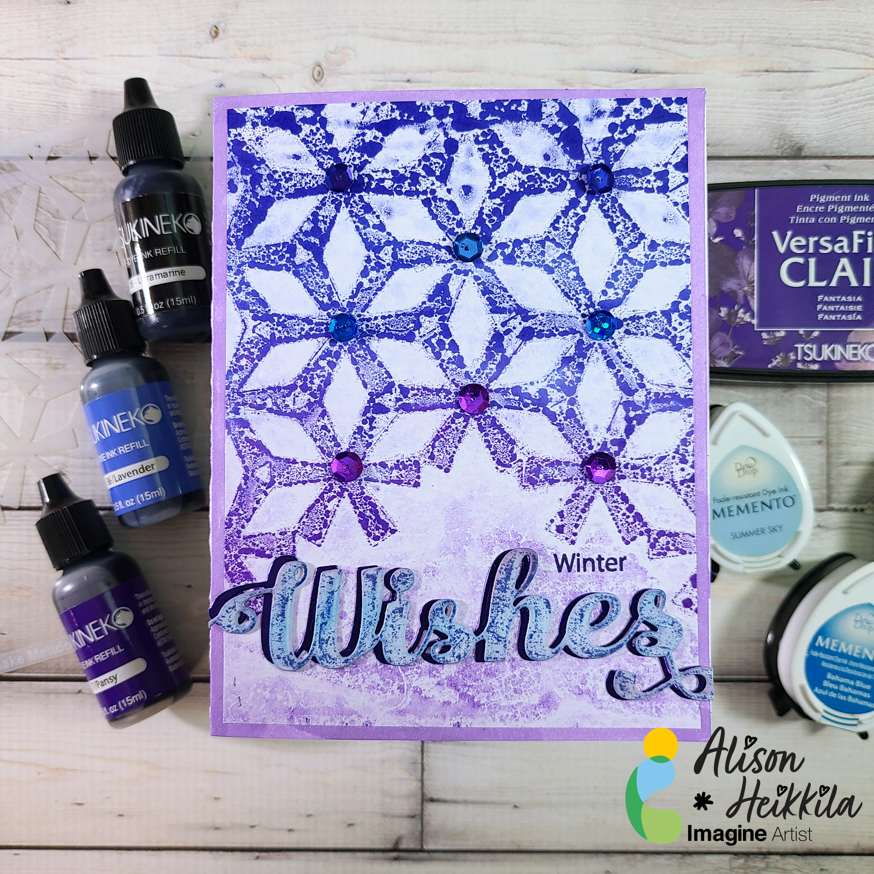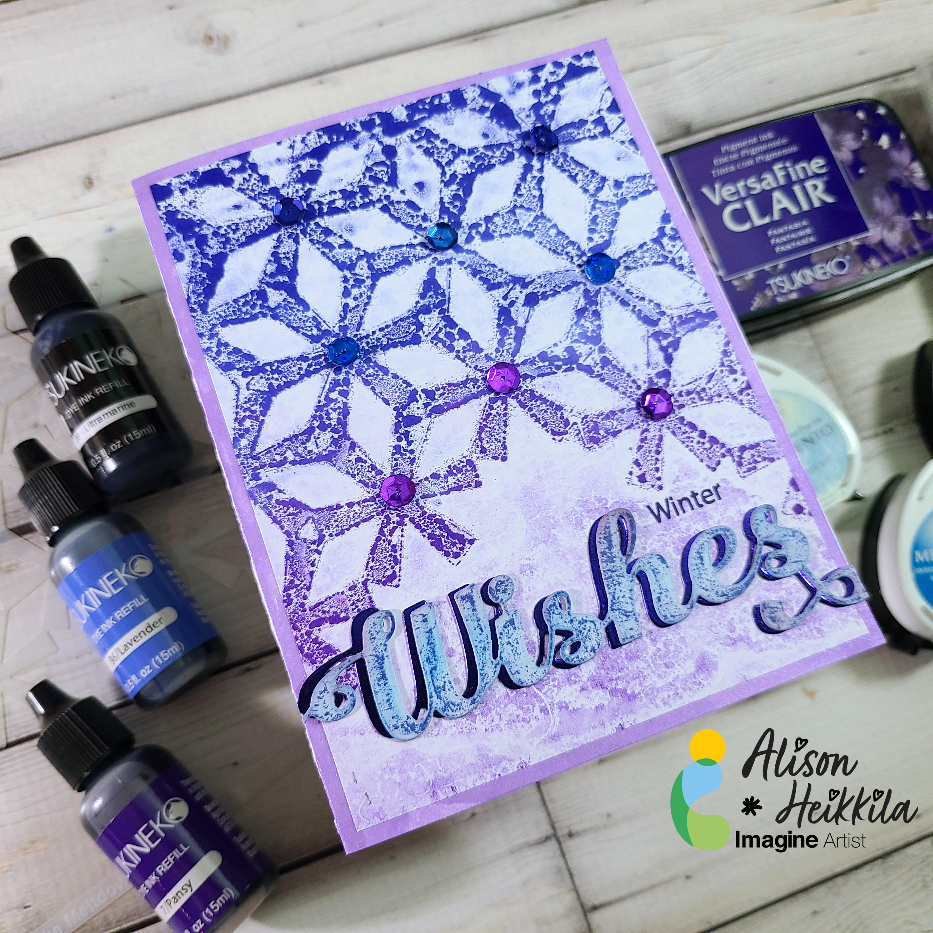 Hello! I’m Alison Heikkila and I’ve got my latest YouTube video for Imagine to share with you today. We’re going to use dye re-inkers on a Gel Press Plate with a pretty stencil to make some cool wintery monoprints. This is one of those instances where I wanted to just keep pulling prints, but I thought you’d want to see a finished card this time.