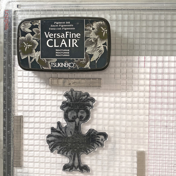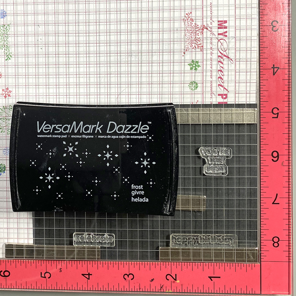 Press the platform’s lid onto the back of the stamps, lift the platform, ink the stamps with the VersaMark Dazzle ink, and stamp. Remove the black panel from the stamping platform.