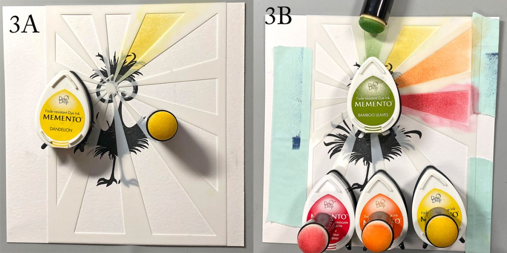 Use low-tack tape to secure the Sunshine Small Stencil onto the stencil so that the “sun” is over the bird’s face. Use a Sponge Dauber to apply Love Letters Memento ink over the mask and masked image onto the image panel (3A).