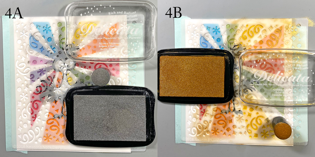 Use low-tack tape to secure the Confetti Stencil over the image panel. Use a Sponge Dauber to apply Silvery Shimmer Delicata ink over the stencil and masked image onto the top left and bottom right of the image panel (3A).