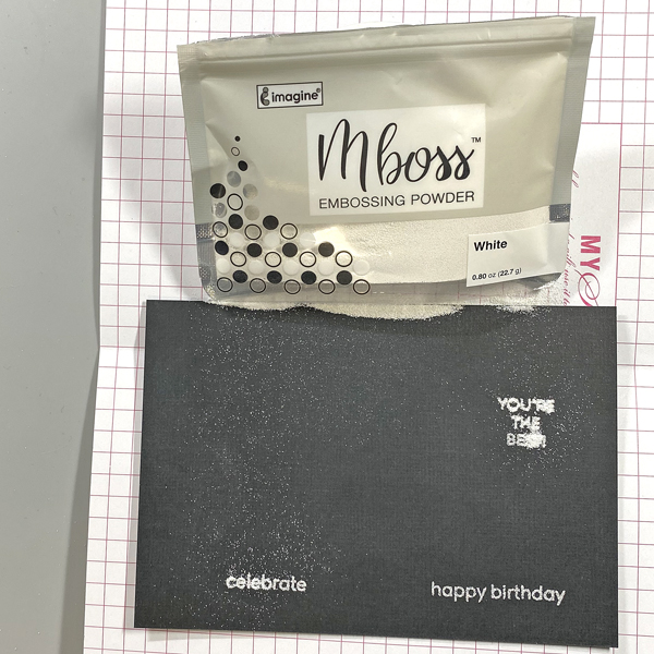Sprinkle White MBoss Powder onto the stamped sentiments, slide the the excess powder back into the bag, and heat set the sentiment.