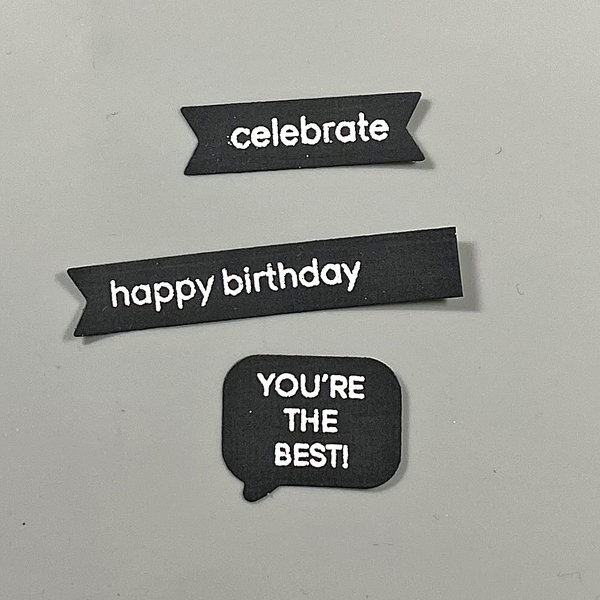 Secure a piece of black cardstock to the base of a stamping platform. Place the “You’re the best” sentiment from the Whatcha Saying? Clear Stamp Set, the “Happy Birthday”, “Celebrate”, and “Happy Birthday” sentiments from the Classic Sentiments Clear Stamp Sets facedown on the black cardstock.
