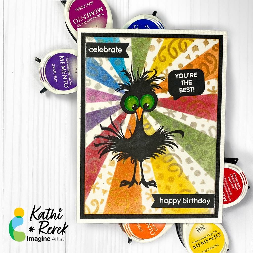 Let’s make a cheerfully bright and fun birthday card with a stamp, two stencils, and lots of ink!