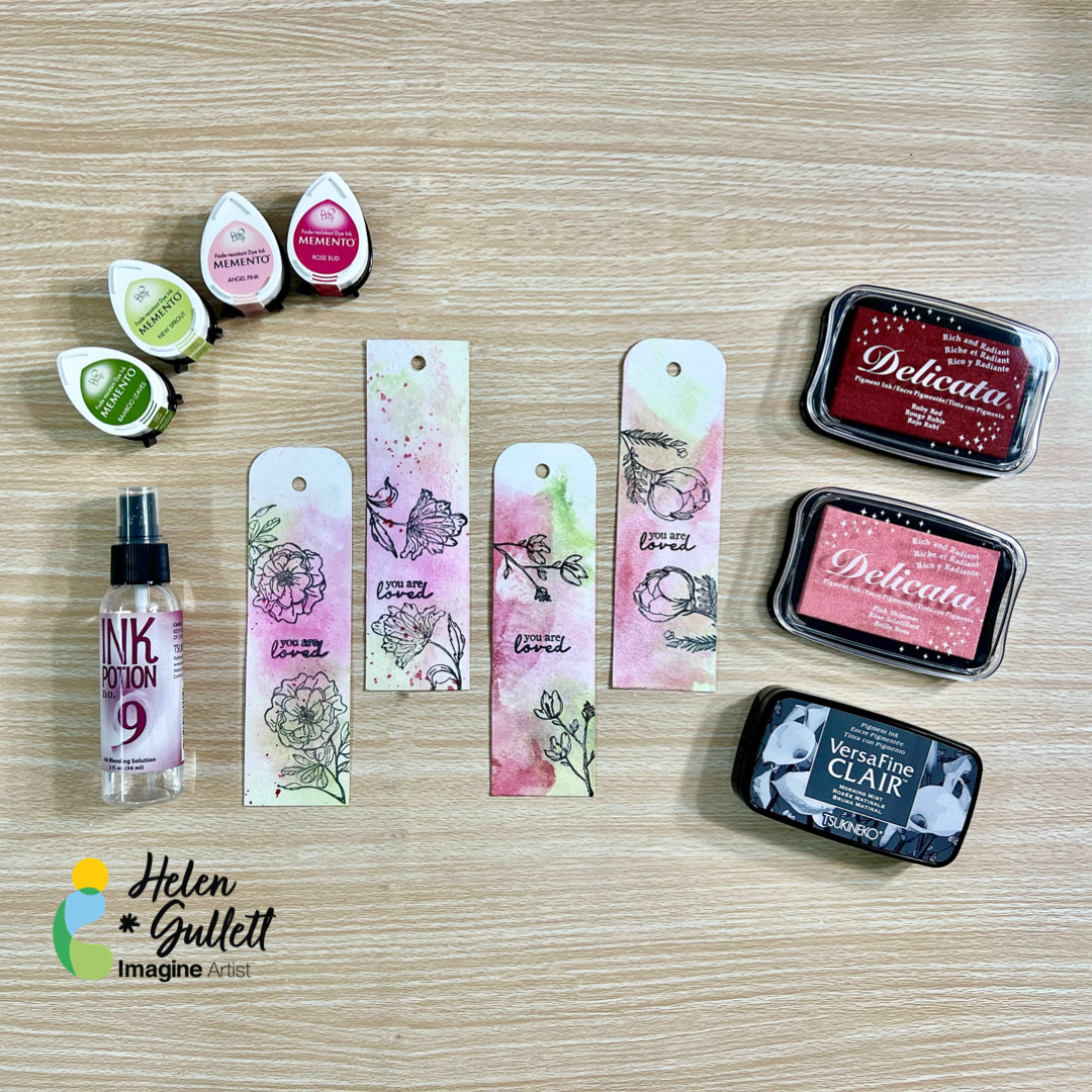 Next step is to create the watercolor wash background using Memento DewDrop ink and Ink Potion No. 9 Spray on each of the bookmarks.