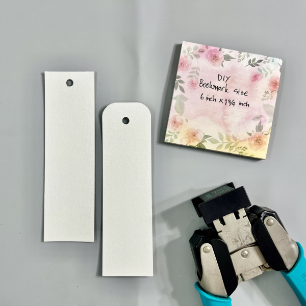 You can leave it as a rectangle or you can round the corner with the corner rounder punch. Next, use a ¼ inch hole punch to punch a hole at the center top of the bookmark for ribbon or teasel.