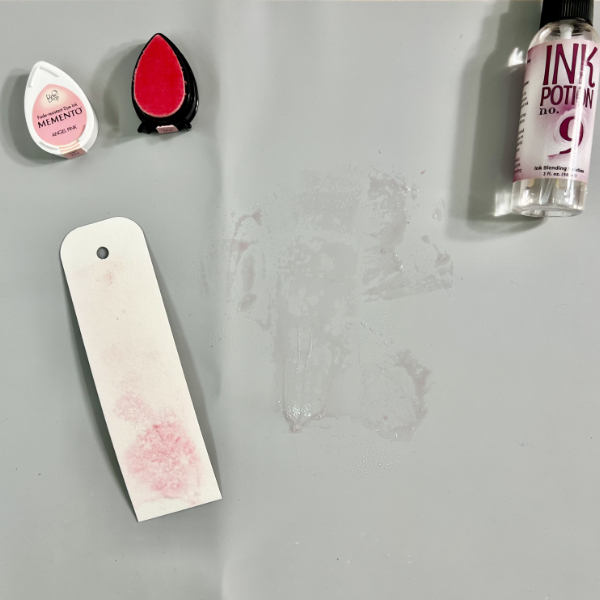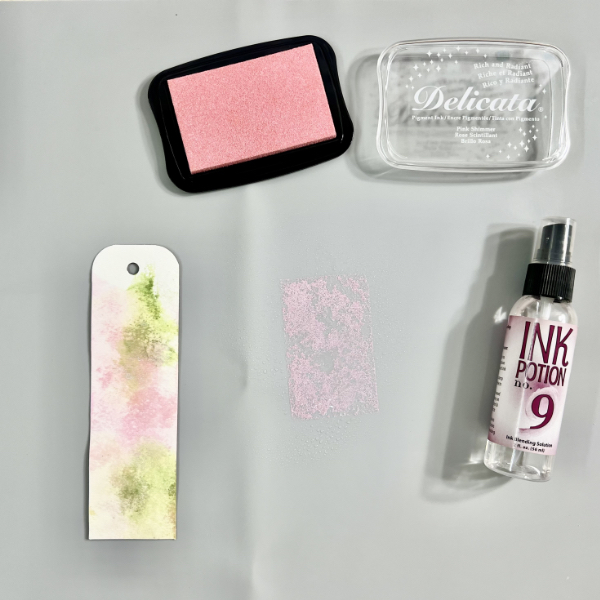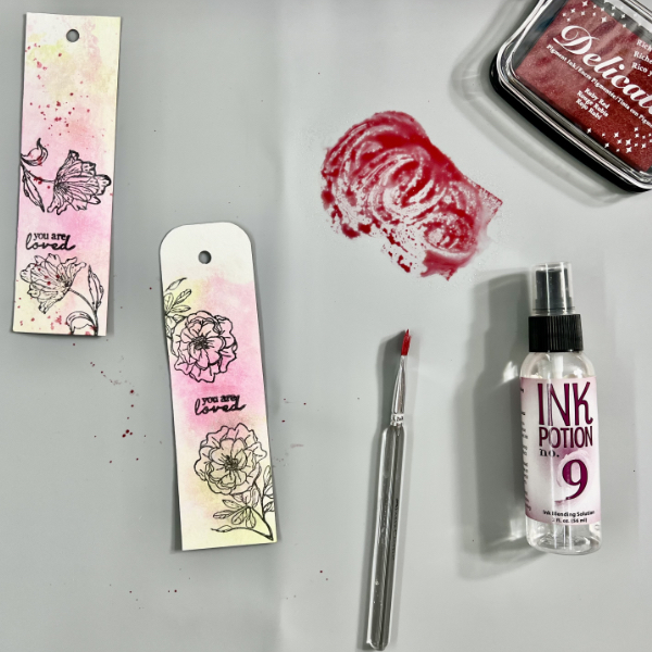 Dab some of the Delicata ink on the craft mat, spray it with the Ink Potion No. 9, and then smoosh the bookmark into the ink. Gently press it to get the ink transferred well.