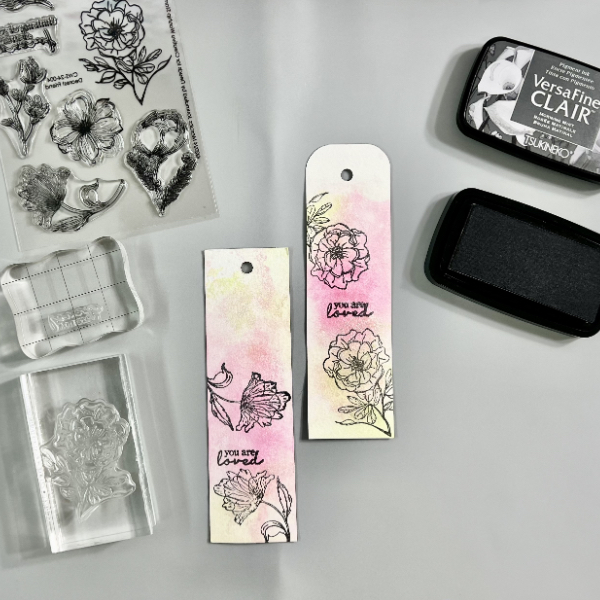 When the bookmark background is completely dry, stamp the image and sentiment on them with VersaFine Clair ink using acrylic blocks (or stamping tool of your choice).