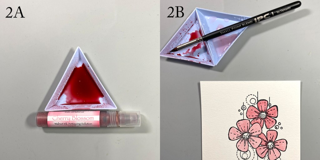 Spray Cherry Blossom Walnut Ink into a small container (2A). Add water into a second container. Use a paint brush to watercolor the flowers’ petals, varying the intensity of the color by diluting the ink with water (2B). When done, wash and dry the containers.