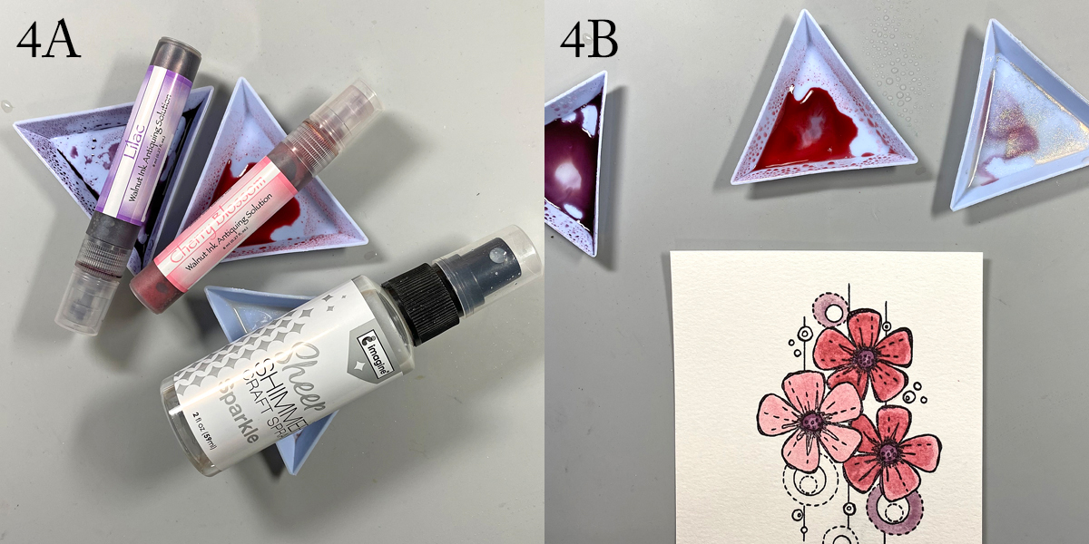 Spray Cherry Blossom and Lilac Walnut Inks into separate containers. Spray a small amount of Sparkle Sheer Shimmer Craft Spray into both containers and into a third container (4A). Use paint brushes to paint the circular elements of the stamped image with sparkly Walnut inks (4B).