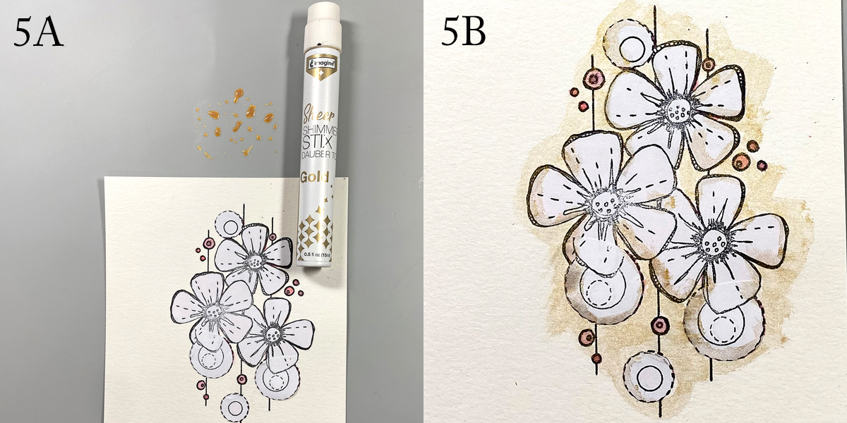 Adhere the repositionable sticker masks from Step 1 atop the stamped and painted images. Smoosh Gold Sheer Shimmer Stix onto the craft mat (5A). Use a brush to apply over the masked images. Also use the applicator top to apply the shimmery gold ink directly to the image panel. Wipe the excess away with a paper towel (5B).