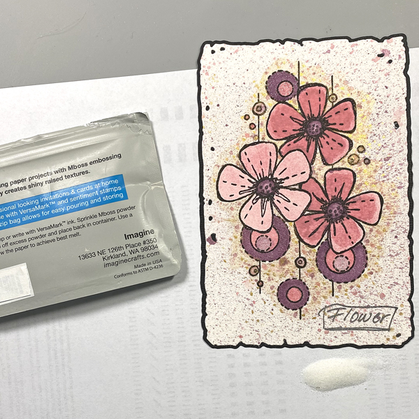 Remove the impute panel from the platform and place onto paper. Sprinkle Clear MBoss powder onto the stamped sentiment. Dump the excess back into the container. Heat set the sentiment.