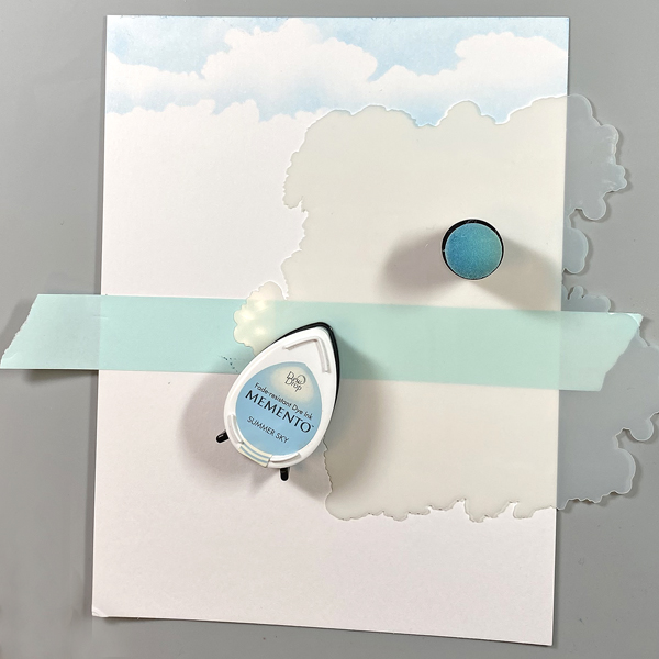 Place a piece of low-tack tape horizontally across a piece of Mixed Media paper. Place the Cloud Edger stencil slightly below the top of the paper. Use a Sponge Dauber to apply Summer Sky Memento Ink over the top of the stencil. Move the stencil downwards and rotate it, then apply Summer Sky Memento ink over the top. Repeat until the cloudy sky is complete.