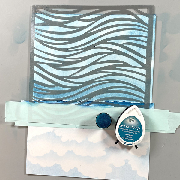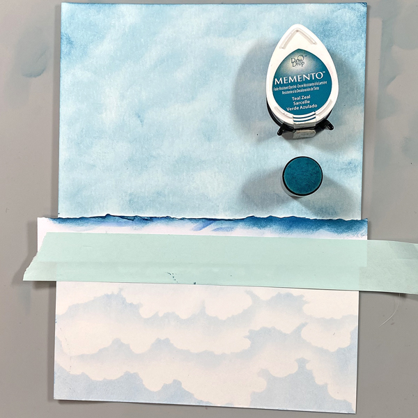 Tear a piece of scrap cardstock and place the torn edge horizontally under the cloudy sky, secured with low-tack tape. Flip the panel 180°. Use a Sponge Dauber to apply a light layer of Teal Zeal Memento Ink to cover the bottom portion of the panel.