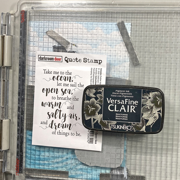 Position the Open Sea Quote Stamp facedown on the lower right part of the image panel. Ink the stamp with Nocturne VersaFine Clair Ink and stamp. Re-ink and stamp again if necessary. Remove the stamp and the image panel from the platform. Heat set the image panel.