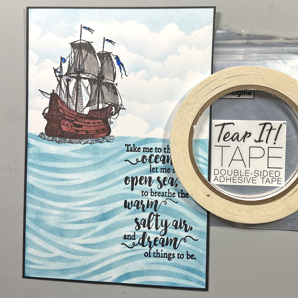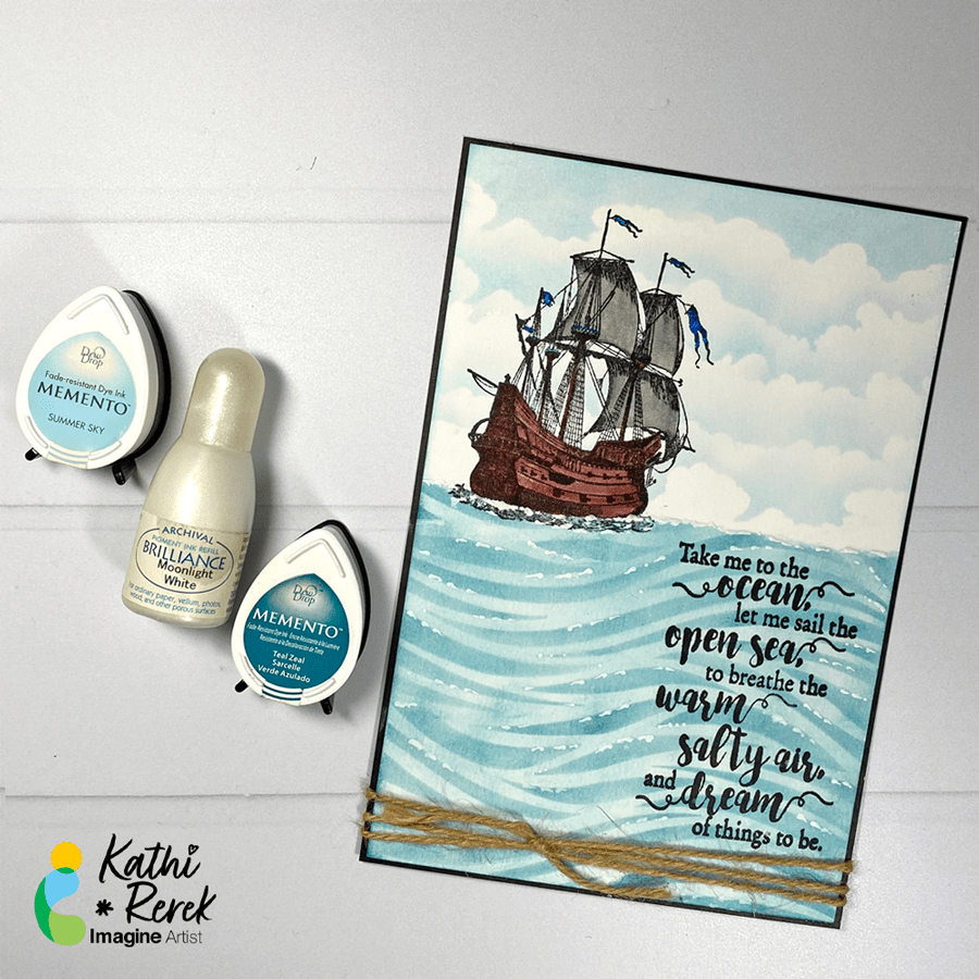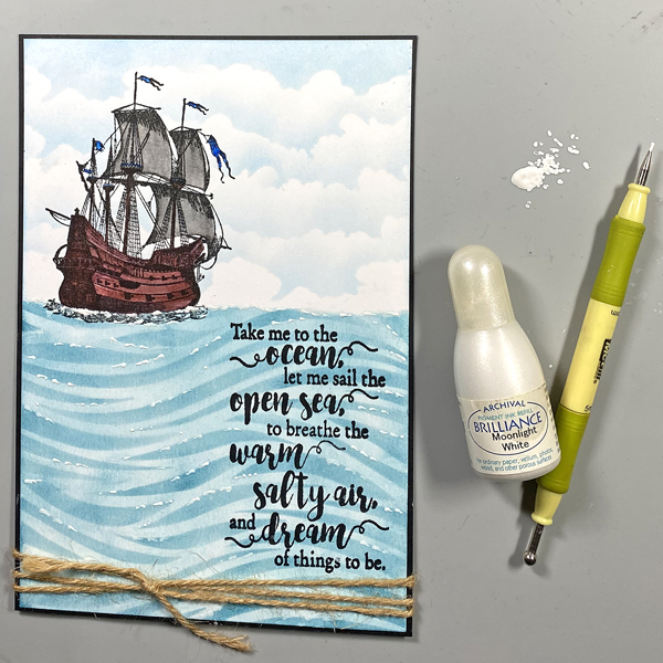 I decided that the sea looked kind of “blah”. I squeezed a few drops of Moonlight White Re-inker onto my craft mat and used a stylus to apply the re-inker to the sea to look like white caps.