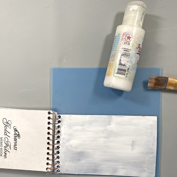 Use a paintbrush and Snowflake Fresco Finish Chalk Acrylic Paint to paint the front and back covers of the memo pad. You don’t have to be neat as brush strokes will only add texture to the project. You might need a second coat to cover the print on the back cover. Let dry, though this paint dries really quickly!
