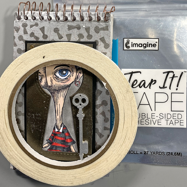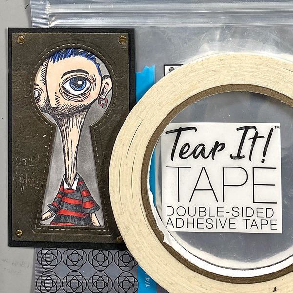 Use Tear It! Tape to adhere the colored image panel behind the opening in the keyhole. Add tiny screw-top brads to the each corner, then mat the keyhole rectangular image panel with black cardstock, cut slightly larger than the keyhole panel.