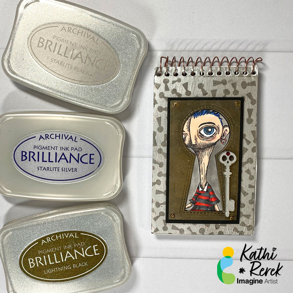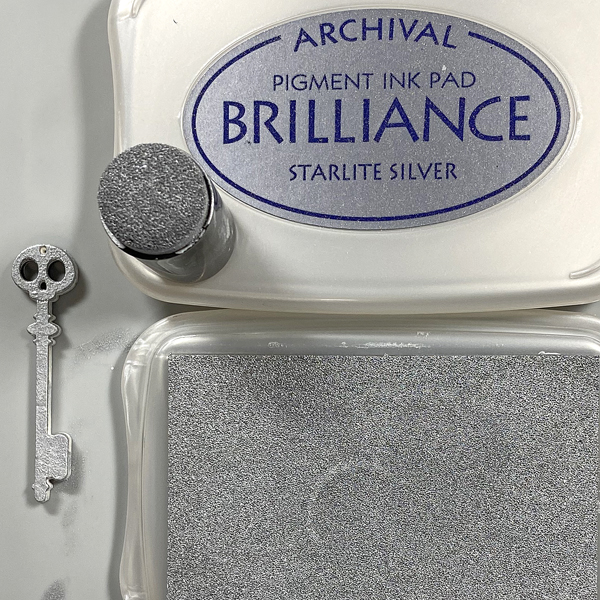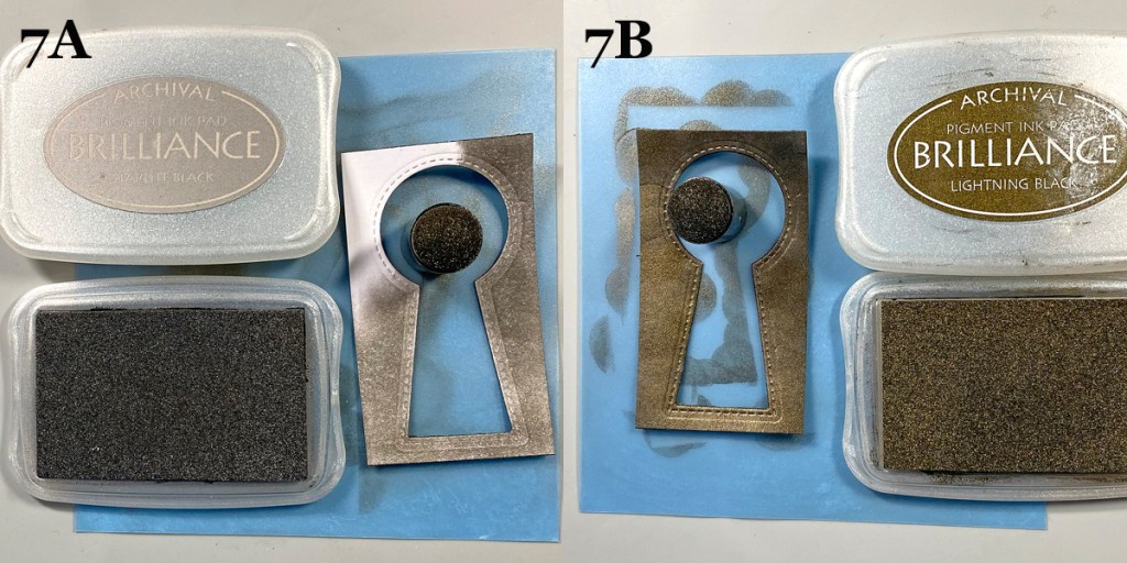 Use Starlite Black Brilliance Ink (7A) to add depth to the silver keyhole. Repeat with Lightning Black Brilliance Ink (7B).