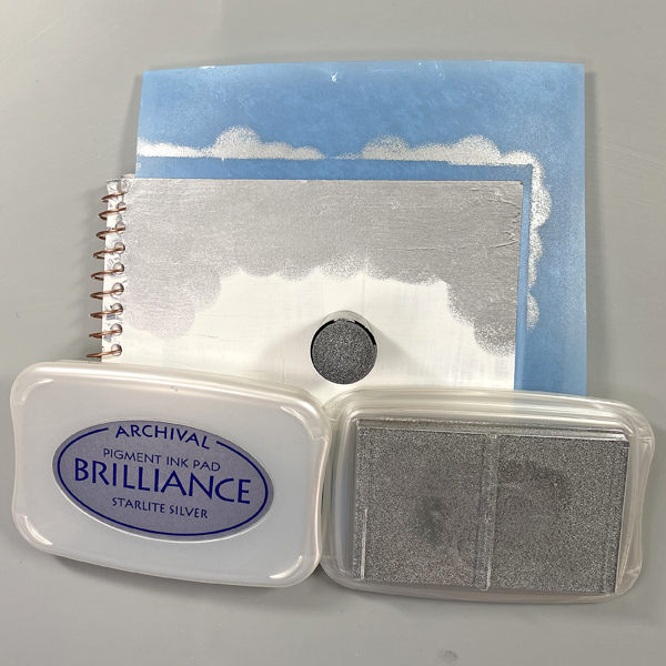Use a Sponge Dauber to apply a Starlite Silver Brilliance ink to both the covers. Heat set.