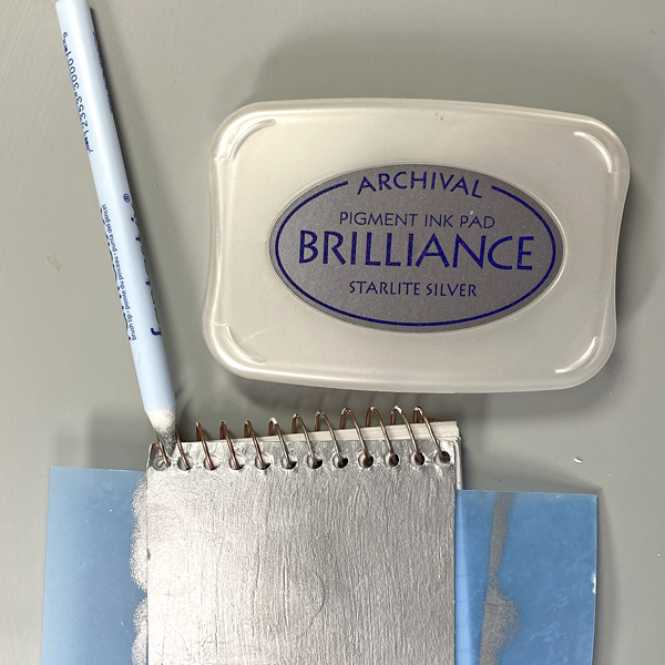 Use a Fantastix to apply Starlite Silver Brilliance ink around the binding rings of the pad.