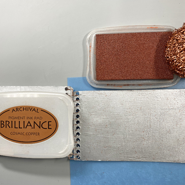 Use copper or steel wool pads to pounce Cosmic Copper Brilliance Ink spots and marks to both covers the pad. Heat set.