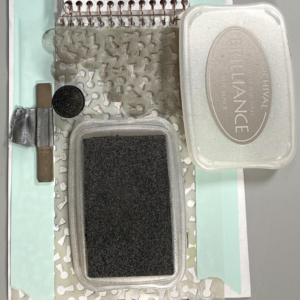 Place a magnet sheet under a piece of paper and set the pad’s front cover onto the paper. Place the Keyhole stencil over the notebook. Secure with magnets and/or low-tack tape. Use a Sponge Dauber to apply Starlite Black Brilliance Ink over the stencil onto the pad’s cover. Let sit for a few minutes and repeat the Ink stenciling. Remove the stencil and heat set the pad’s cover.
