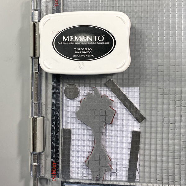 Use a Sponge Dauber to apply Starlite Silver Brilliance Ink to a small piece of black cardstock. Heat Set. Use the Keyhole Cutting Die to cut the inked cardstock. Sorry that there’s no photo.