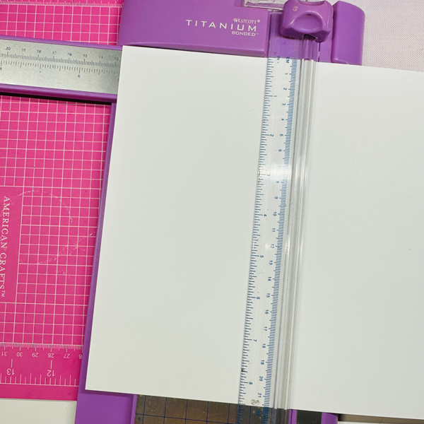 Create your card base by taking a piece of white cardstock measuring 10” x 7” and score it down the middle at 5”.