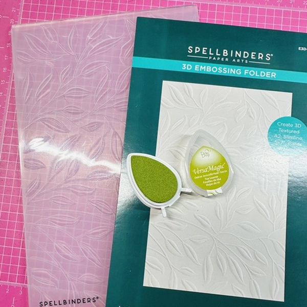 To create the colored embossed background, you will need the folder you chose. I am using the Leafy folder with VersaMagic Dew Drop in “Hint of Pesto” and “Tea Leaves”.