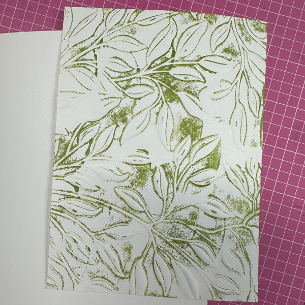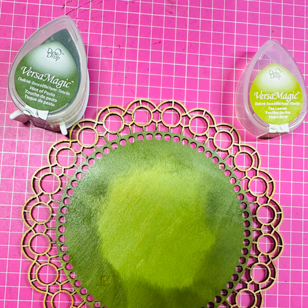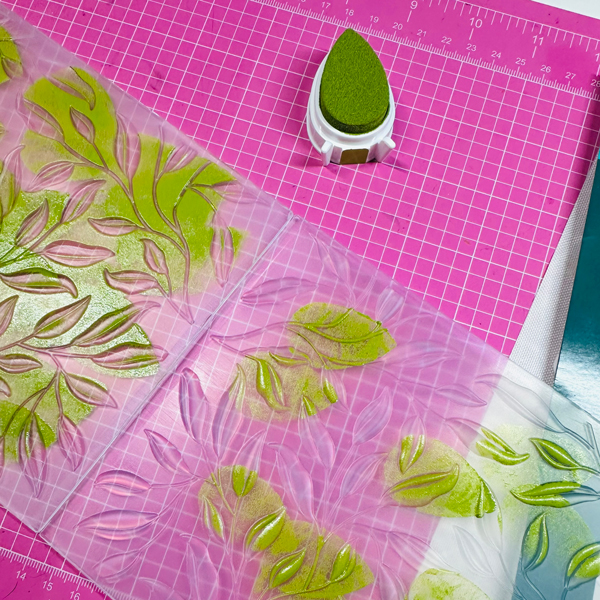 To create the colored embossed background, you will need the folder you chose. I am using the Leafy folder with VersaMagic Dew Drop in “Hint of Pesto” and “Tea Leaves”.