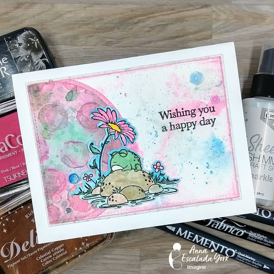 Die cut sparkly white paper with a slightly larger rectangular die. Glue the main (frog)