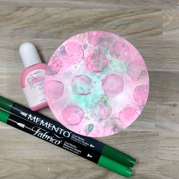 After the watercolor paper has dried, ink blend the edge of the circular die cut with Pink