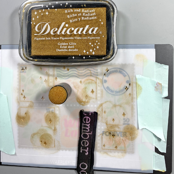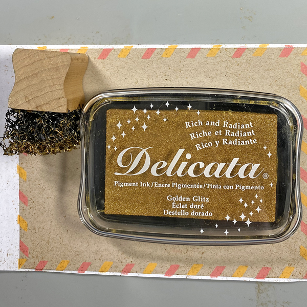 Use the pouncy tool to apply Golden Glitz Delicata Ink randomly over the Postage Collage Die-cut panel. Heat set the panel and set it aside.
