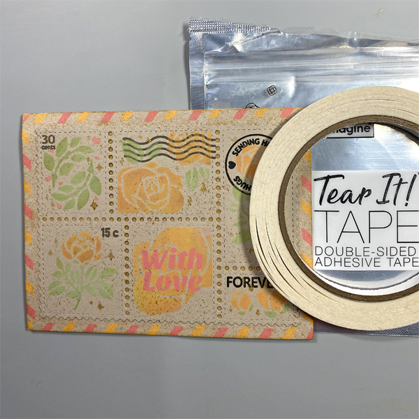 Use Tear-It! Tape to adhere the Postage Collage Die-cut panel to the 5.5” x 4.25” panel, then use to adhere the panel to an A2 card cut from the same cardstock.