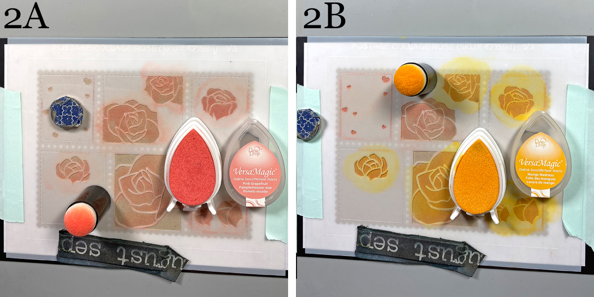Place a magnetic panel onto the cardstock panel. Use temporary adhesive to secure the Rose Postage Collage die-cut to a piece of scrap paper. Use magnets and low-tack tape to secure the first Rose Postage Collage Stencil to the die-cut. Use a Sponge Dauber to apply Pink Grapefruit VersaMagic Ink over the stencil onto the die-cut (2A). Use another Sponge Dauber to apply Mango Madness VersaMagic Ink over the stencil onto the die-cut, blending the ink as you go (2B).