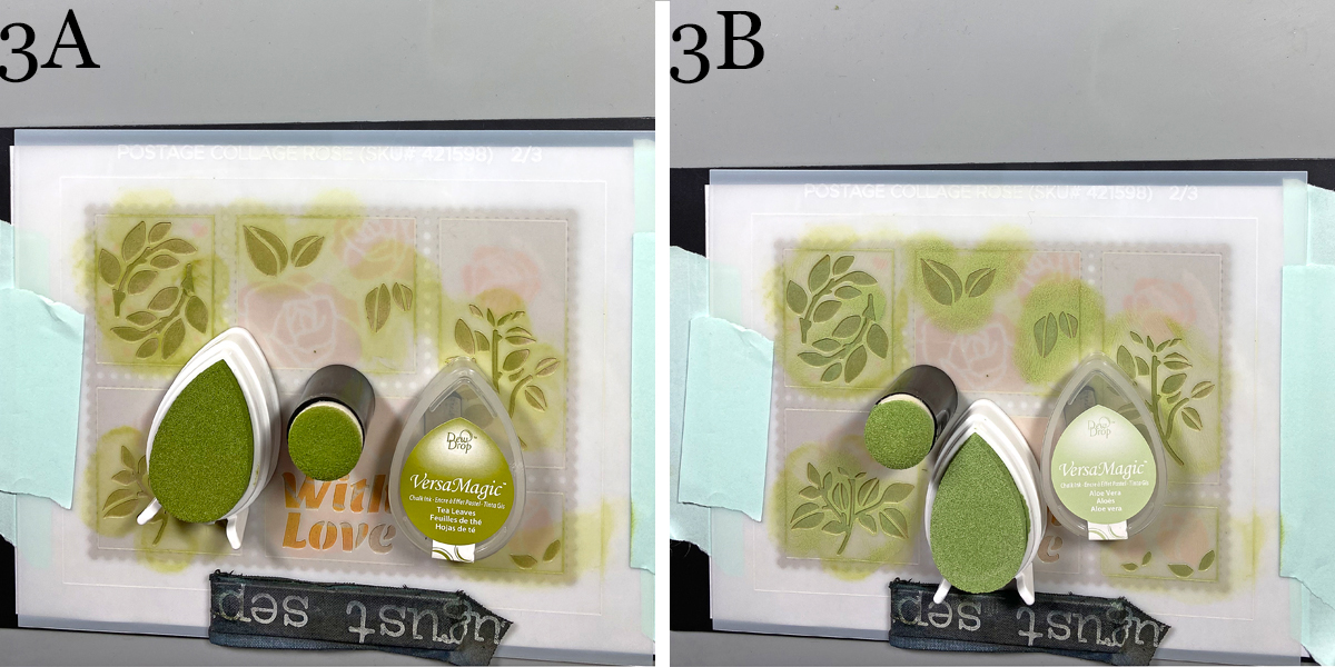 Use magnets and low-tack tape to secure the second Rose Postage Collage Stencil to the Postage Collage die-cut. Use a Sponge Dauber to apply Tea Leaves VersaMagic Ink over the stencil onto the die-cut (3A). Use another Sponge Dauber to apply Aloe Vera VersaMagic Ink over the stencil onto the die-cut, blending the ink as you go (3B). Keep the Postage-Collage Die-cut panel in place. Remove the stencil and clean. Heat set the collage panel.