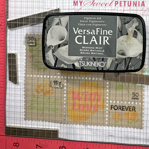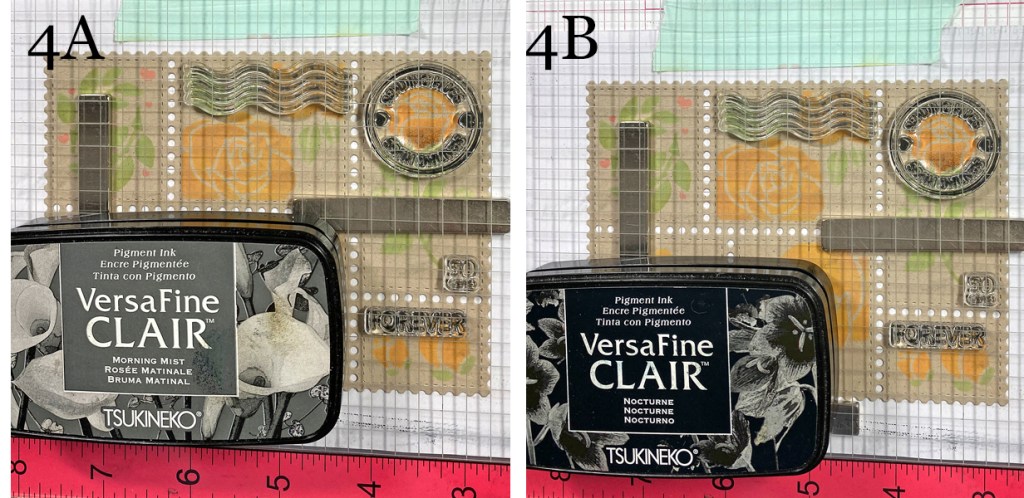 Move the Postage Collage Die-cut panel to the base of a stamping platform. Secure with magnets. Position the postmark, cancellation, cost, and “forever” stamps from the Postage Collage Stamp Set facedown on the panel. Press the platform’s lid onto the back of the stamp, lift, ink the stamps with Morning Mist VersaFine Clair Ink, and stamp (4A). I re-inked and stamped some of the stamps with Nocturne VersaFine Clair Ink to add visual weight.