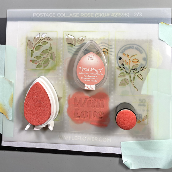 Move the Rose Postage Collage Die-cut back onto the magnet panel and secure the second Postage Collage Stencil with magnets and low-tack tape overtop. Re-use the Sponge Dauber from Step 2A to apply Pink Grapefruit VersaMagic Ink over the “With Love” words on the stencil onto the Postage Collage Die-cut panel. When done, lift the stencil, clean it, then heat set the Postage Collage Die-cut panel.