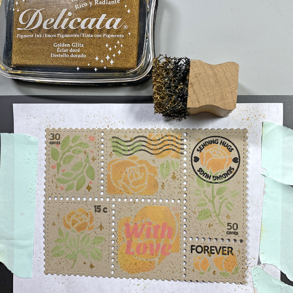 Move the Rose Postage Collage Die-cut panel back to the large magnet panel. Use magnets and low-tack tape to secure the third Postage Collage Stencil to the Postage Collage Die-cut panel. Use a Sponge Dauber to apply Golden Glitz Delicata Ink over the stencil onto the Postage Collage Die-cut panel.