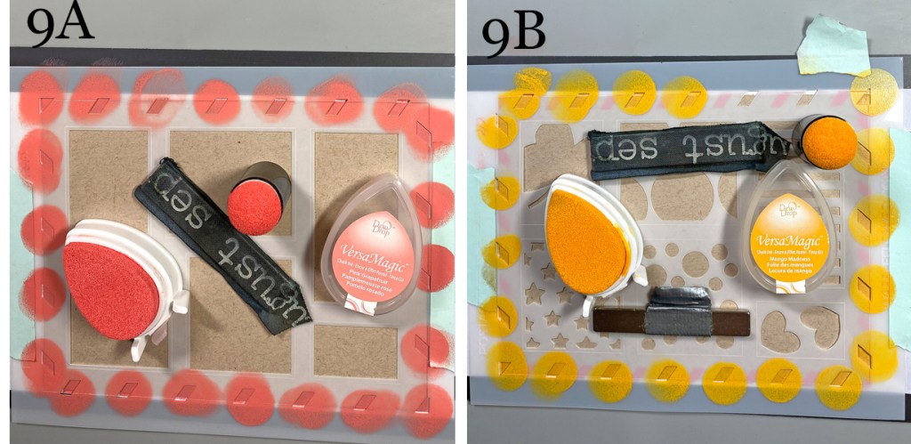 Use magnets and low-tack tape to secure the second Postage Collage Stencil to the panel. Use a Sponge Dauber to apply Mango Madness VersaMagic Ink over the stencil onto the die-cut (9B). Remove the stencil and heat set the panel.