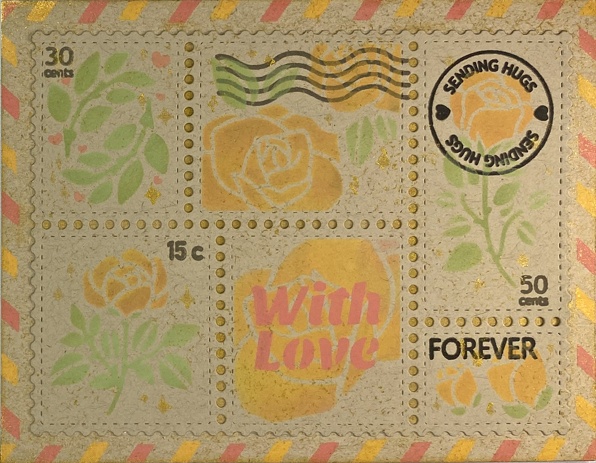 I decided that I wanted to add the words “With Love” from the second Postage Collage Stencil and that I wanted to add more stamped postage items to the collage.