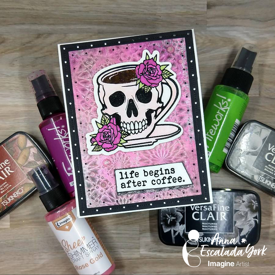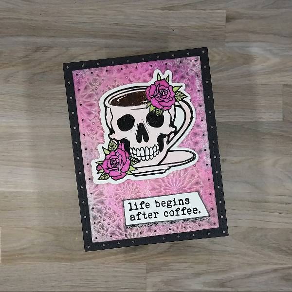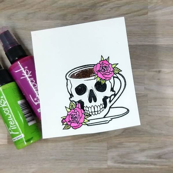 the spray to watercolor the stamped flowers surrounding the coffee cup. Repeat the process