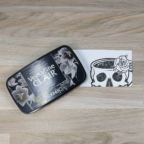 Then press the edges of the sentiment into the Nocturne VersaFine Clair ink to create a border.